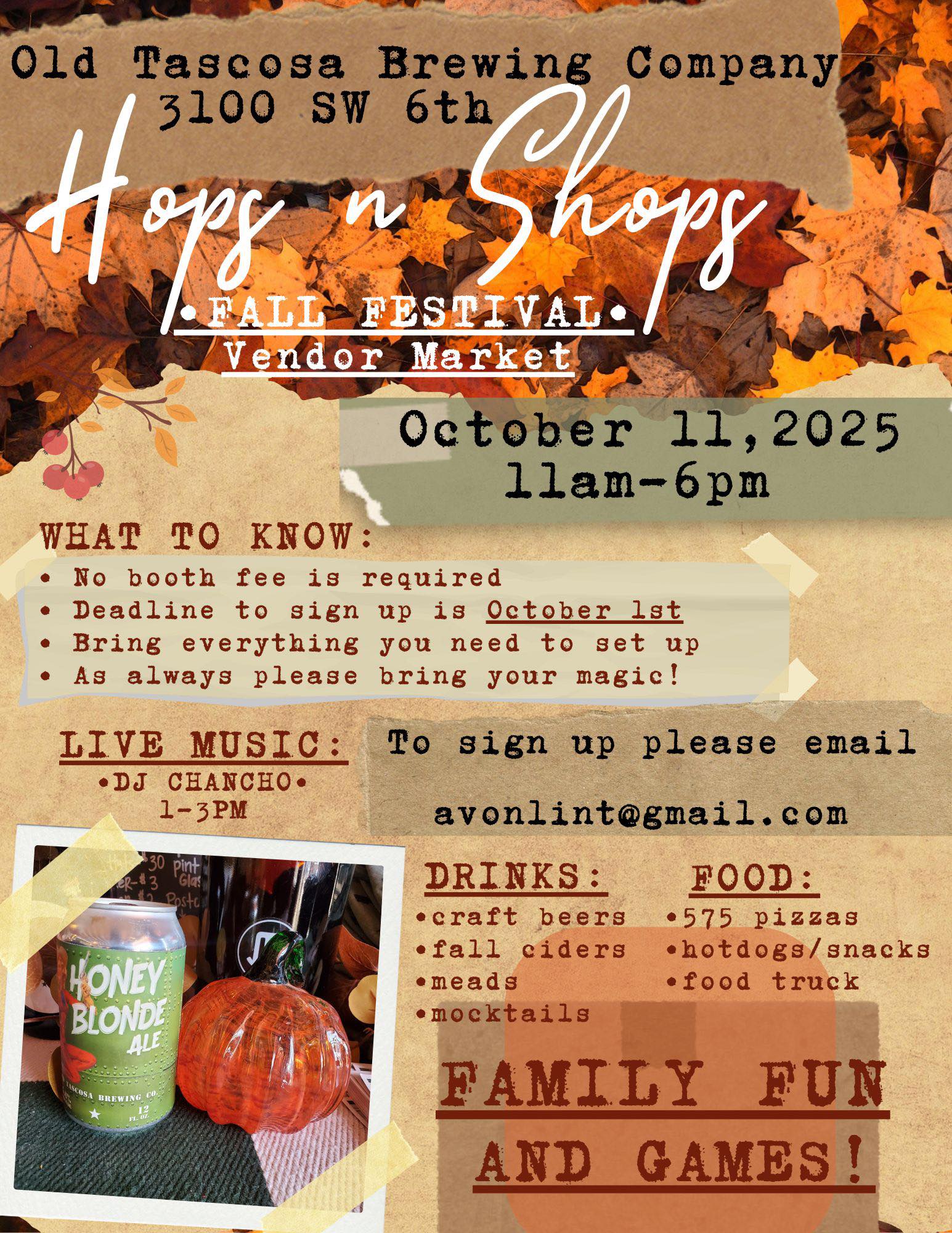 Join us for our second Hops n' Shops Vendor Event, this one is themed "Fall Fest" - We love the fall. We love creativity. This vendor event, plus live music, and all our beverage and food offerings, is not one to miss.